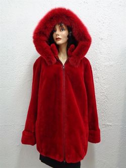 STYLISH AND ELEGANT BRAND NEW RED SHEARED BEAVER & FOX FUR COAT FOR WOMEN! IT IS MADE WITH FULLY LET OUT SKINS, THE BEST! IT IS ACCENTUATED WITH RED COLOR FOX FUR TRIMMING AROUND THE HOOD.