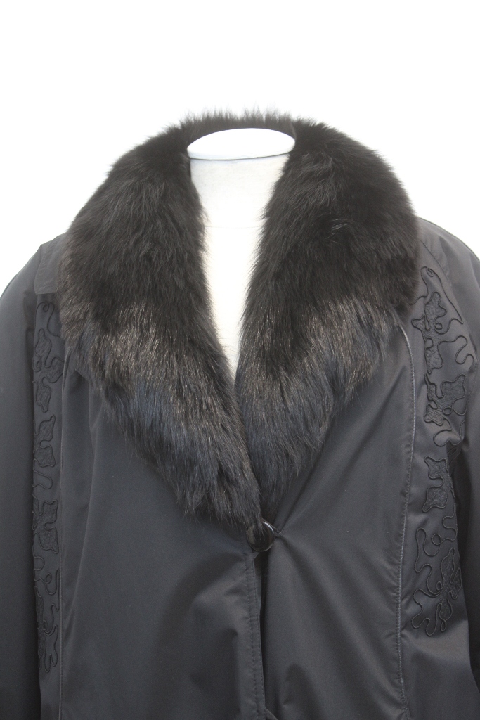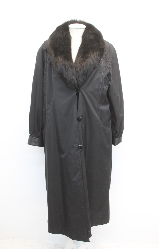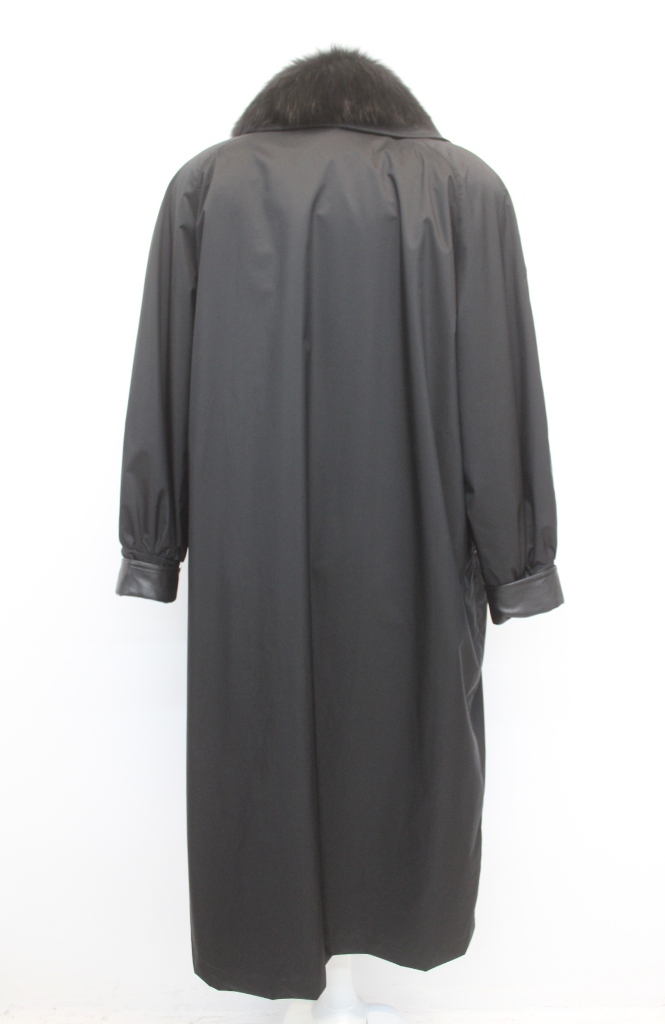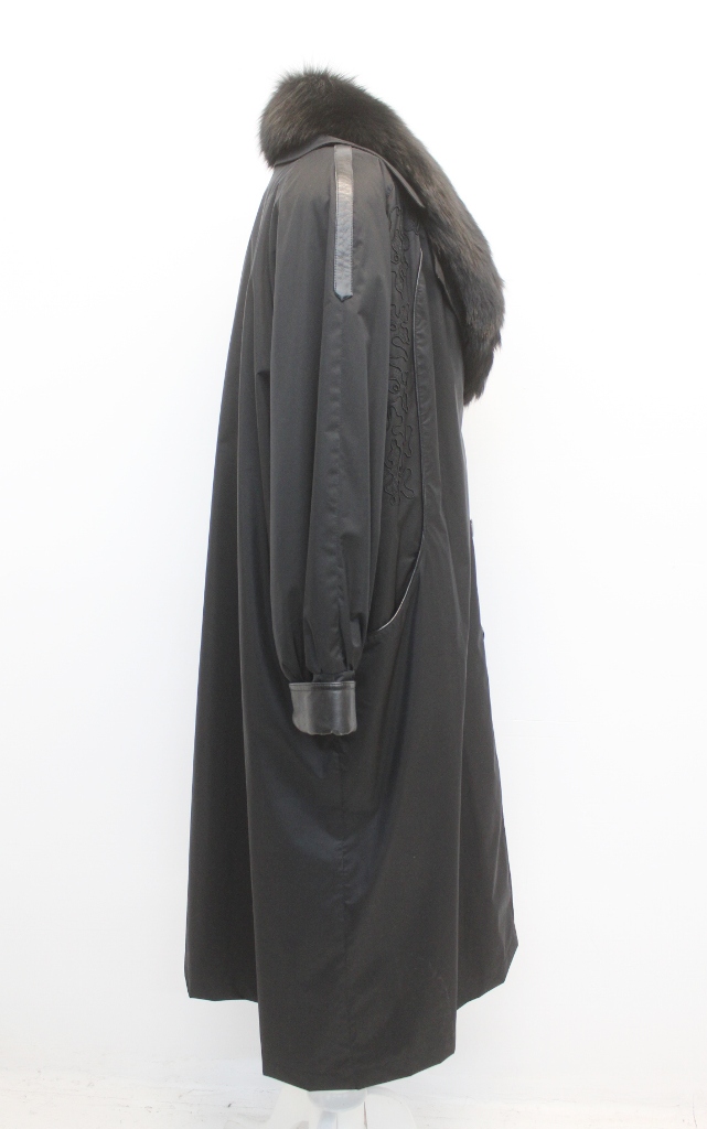 FEATURES A CLASSIC BLACK FOX FUR SHAWL COLLAR, SECURE BUTTON CLOSURE, AND LEATHER BRACELET/TOP CUFFS.
