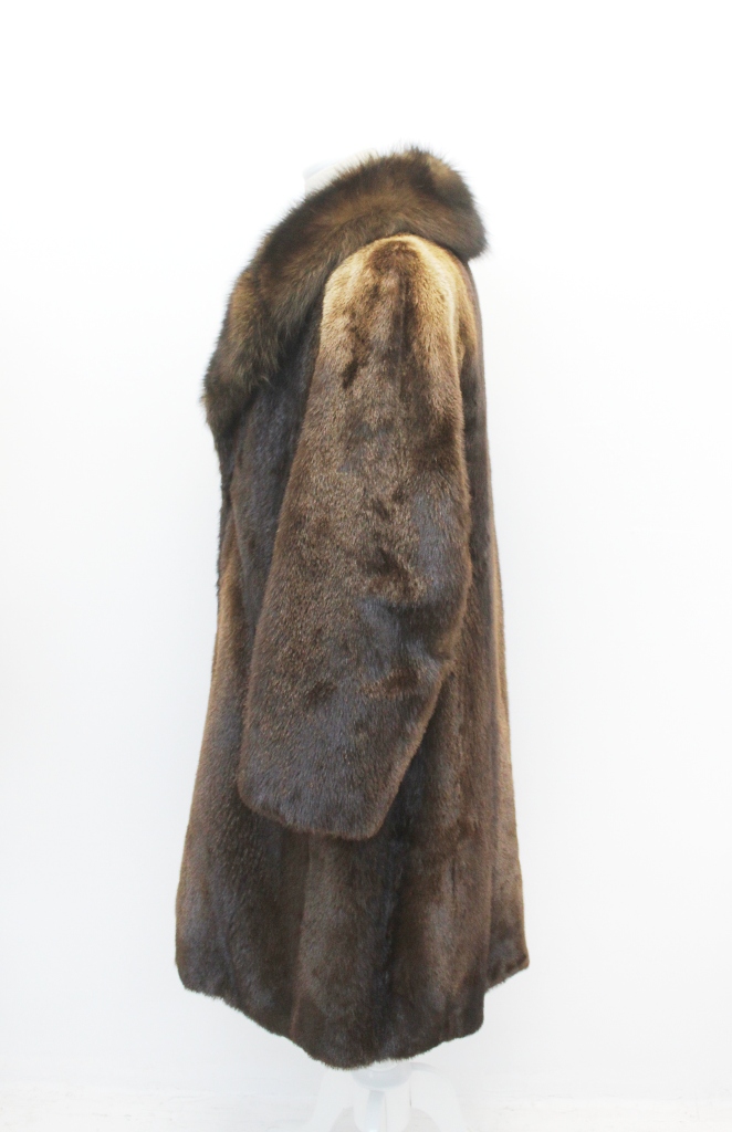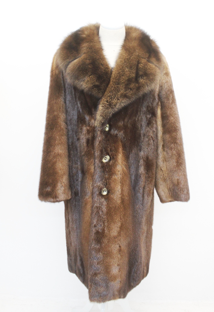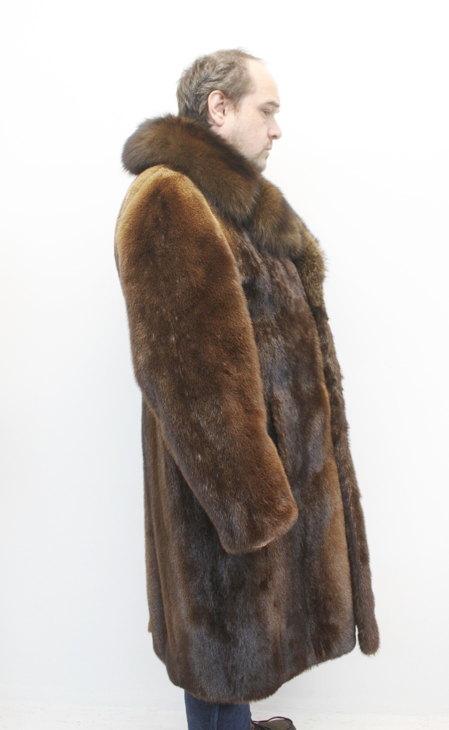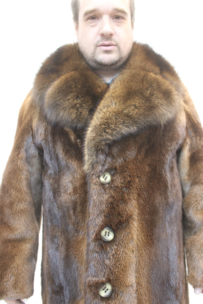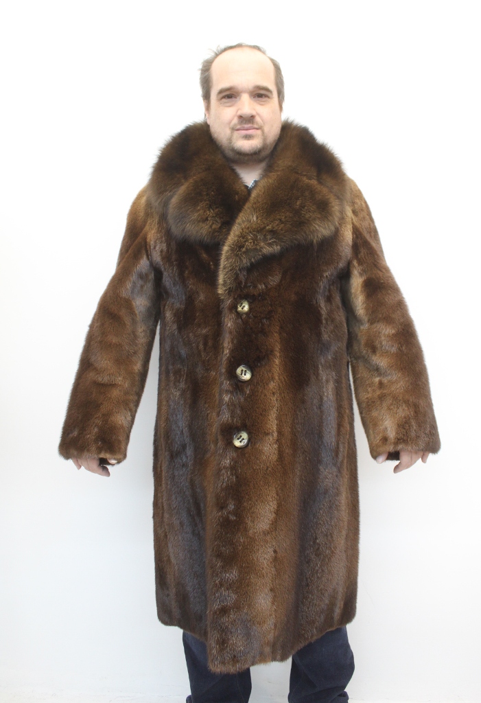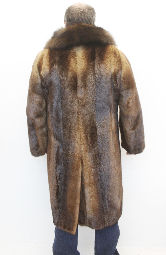 MEN’S EXCELLENT ARCTIC BEAVER FUR COAT WITH A LUXURIOUS FISHER FUR NOTCH COLLAR. FEATURES A CLASSIC BUTTON AND BUTTONHOLE CLOSURE.
