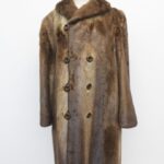 THE COLLAR TYPE IS “NOTCH” WITH BLACK MUSKRAT FUR. IT CLOSES WITH BUTTON CLOSURE AND DETACHABLE BELT. THE FUR LINING IS ATTACHED TO THE COAT.