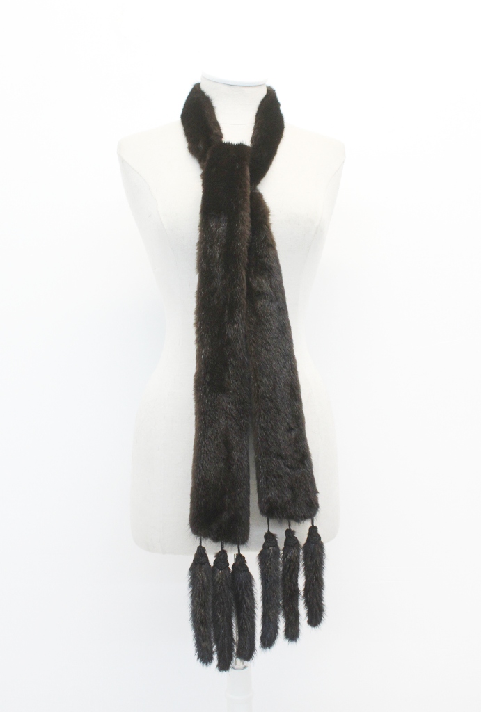 VERY STYLISH DARK BROWN DARK RANCH MINK FUR SCARF WITH MINK TAIL FRINGES FOR WOMEN!