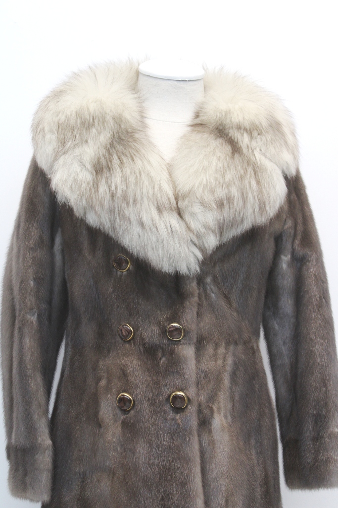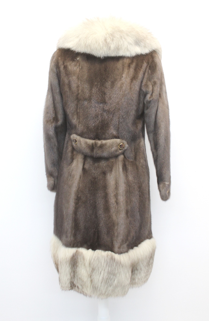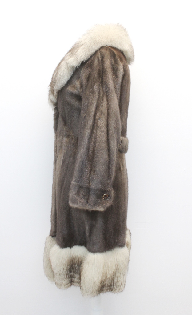EXCELLENT LUTETIA MINK FUR COAT FOR WOMEN WITH LUXURIOUS BLUE FOX FUR TRIMMING AT THE BOTTOM AND COLLAR.