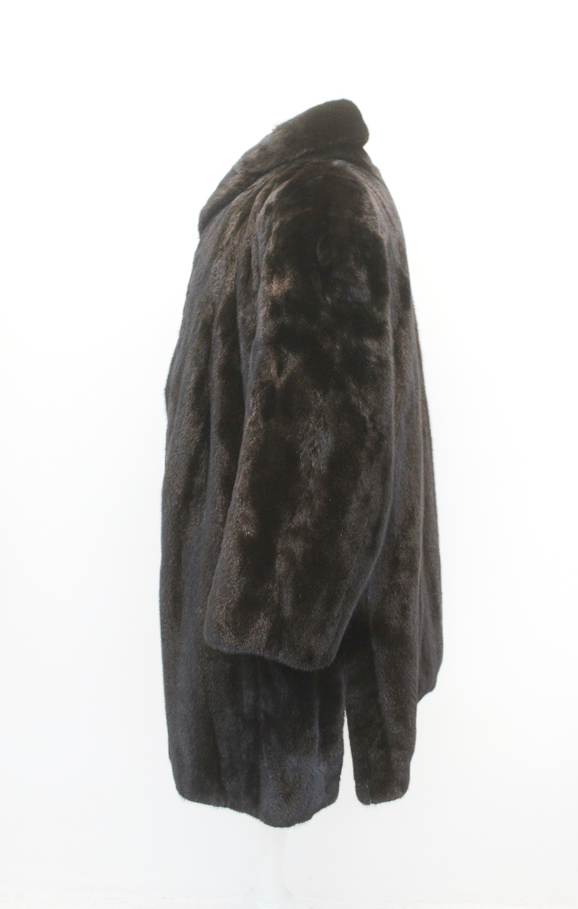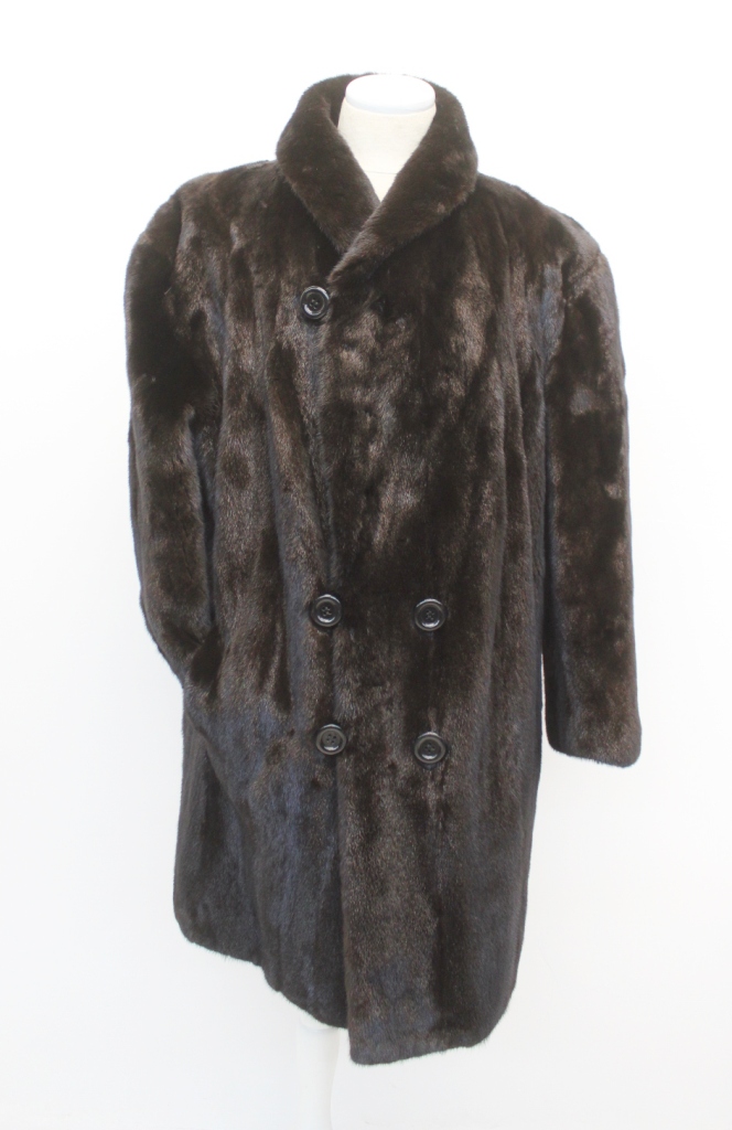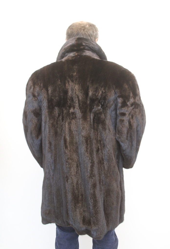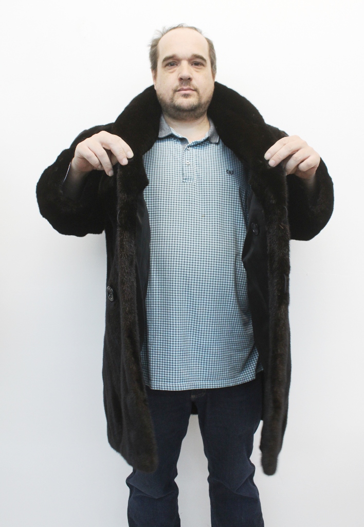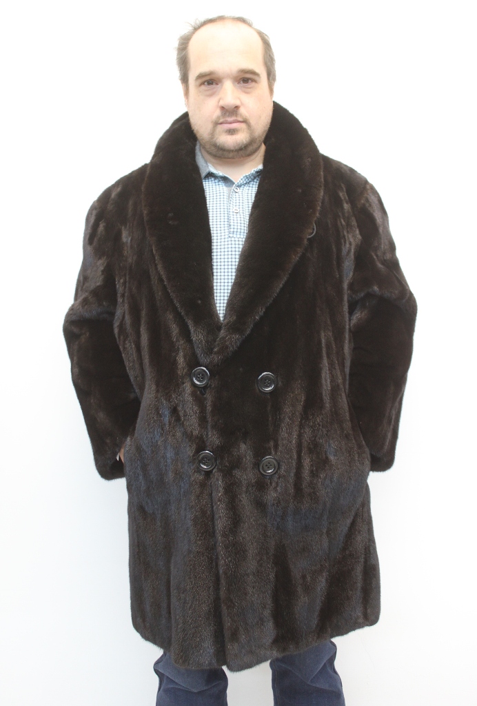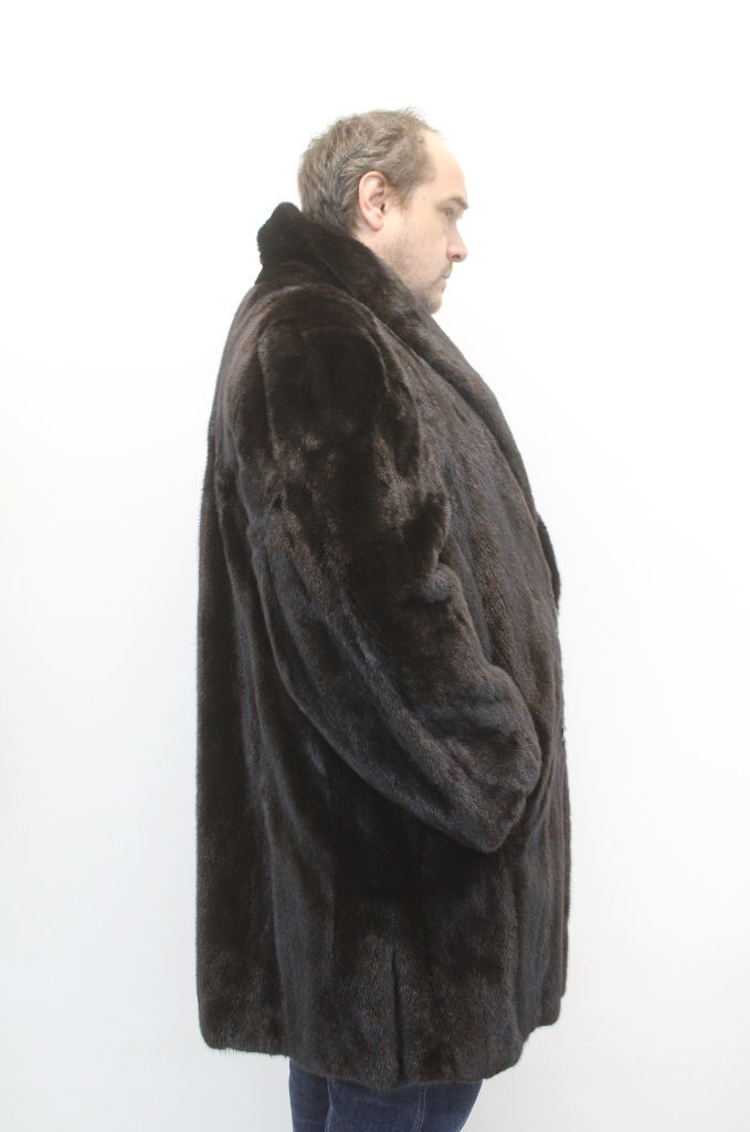 MEN’S DARK RANCH MINK FUR COAT WITH A SHAWL COLLAR, BUTTON CLOSURE AND VENT SLITS ON THE SIDES. ELEGANT, CLASSIC AND LUXURIOUS, THIS COAT OFFERS TIMELESS STYLE AND WARMTH, PERFECT FOR FORMAL OR SPECIAL OCCASIONS.