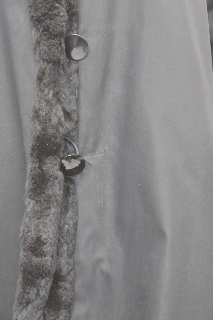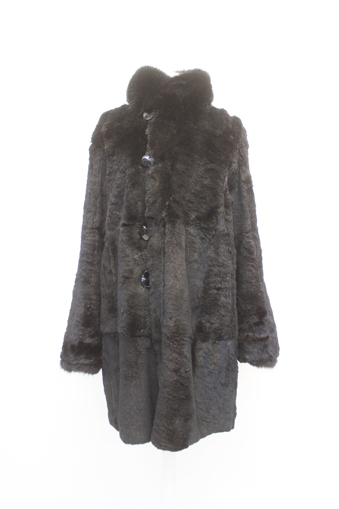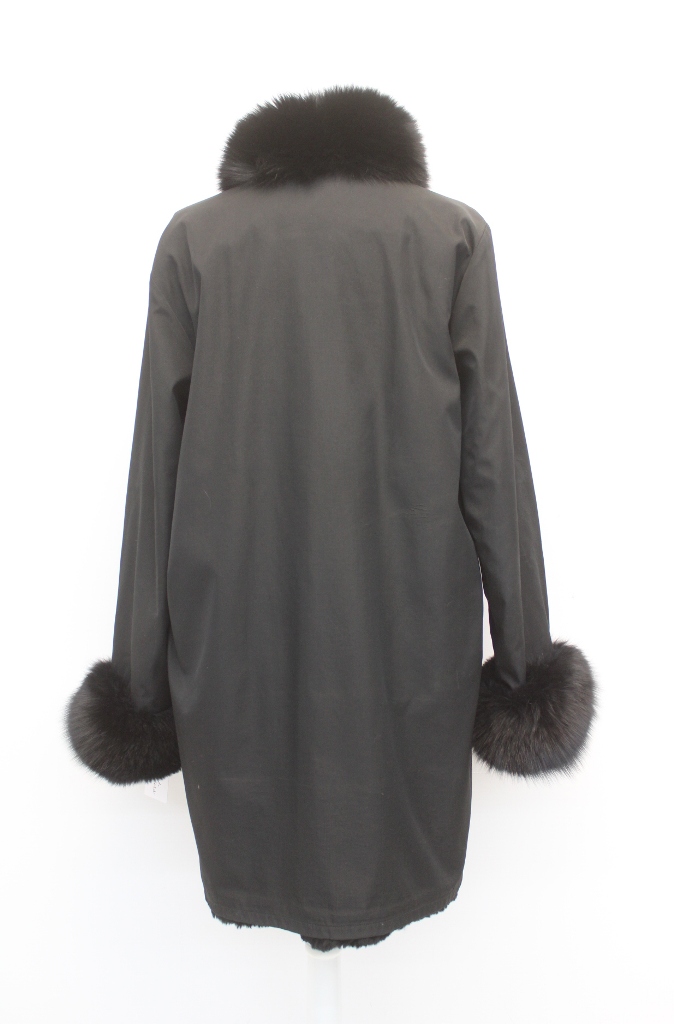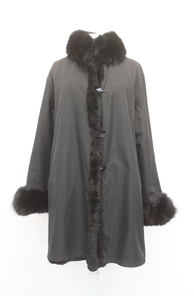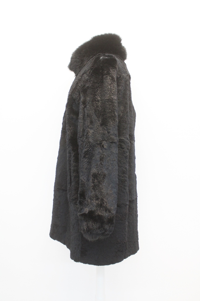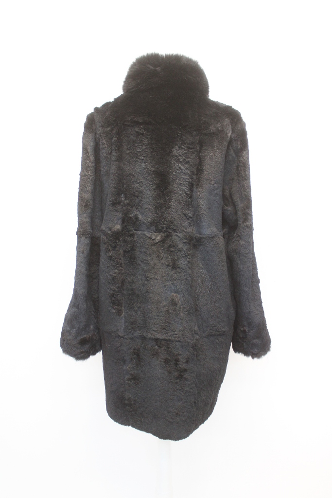 ELEGANT BLACK SHEARED RABBIT FUR REVERSIBLE COAT FOR WOMEN WITH LUXURIOUS BLACK FOX FUR COLLAR AND CUFFS.