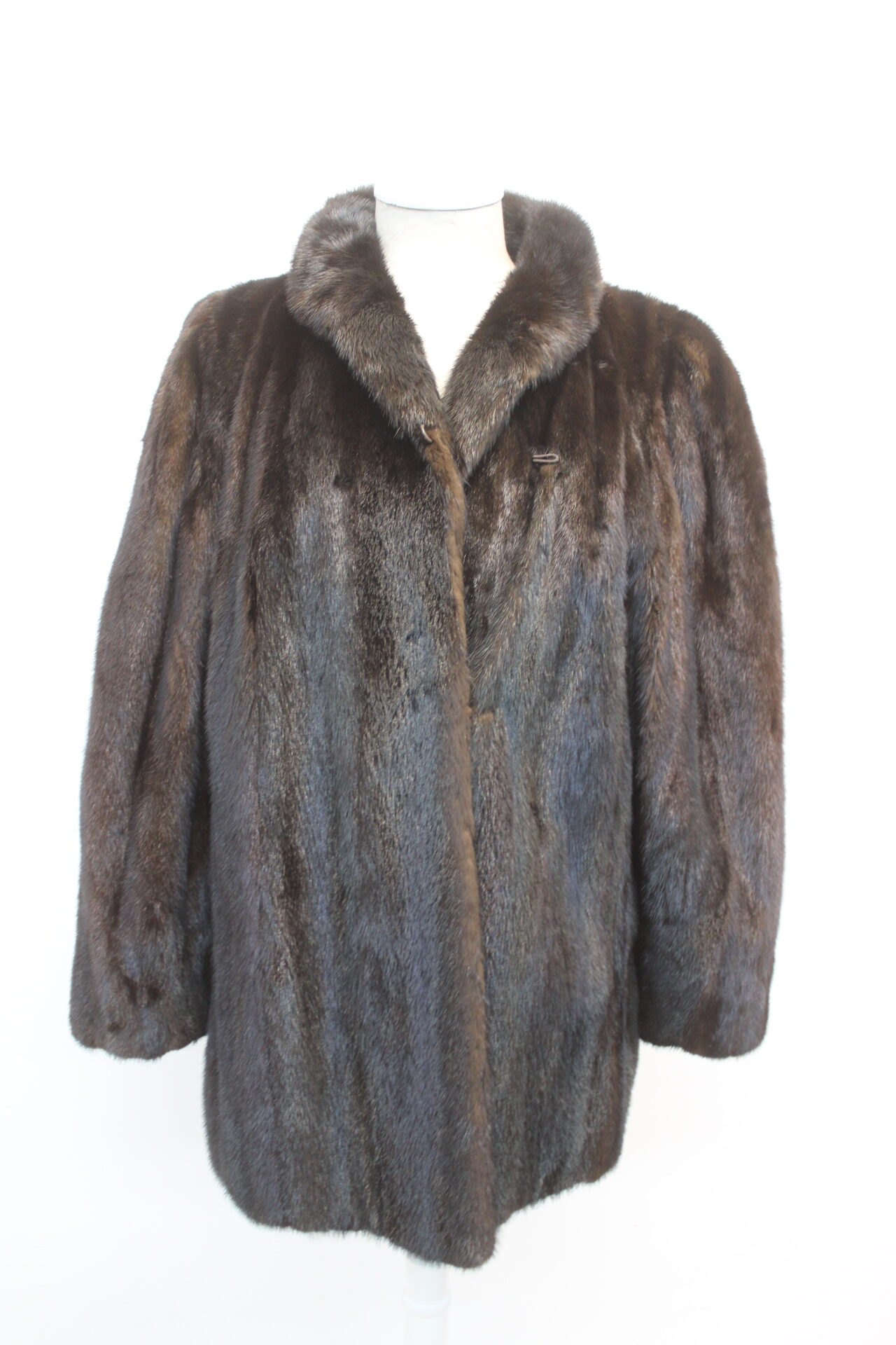 BEAUTIFUL NATURAL CANADIAN DARK RANCH MINK FUR JACKET FOR WOMEN MADE FROM FULLY LET OUT SKINS, THE BEST! THE COLLAR TYPE IS “SHAWL”, THE SLEEVES ARE STRAIGHT, IT HAS TWO SIDE POCKETS AND HOOK & EYE CLOSURE.